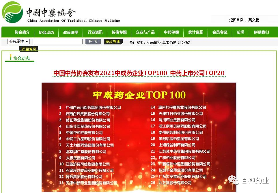 近日,在中国中药协会中药产业信息发布会上,2021中成药企业TOP100发布。百神药业荣耀上榜,品牌实力位列全国中游。